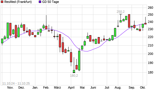 Mit dem Rücksetzer auf 236,70 EUR hat die Resmed-Aktie am 10.10.2025 die 50-Tage-Linie nach unten gekreuzt.Die Resmed-Aktie befindet sich seit dem 17.07.2025 im langfristigen Aufwärtstrend ...weiterlesen