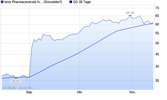 Mit dem Rücksetzer auf 59,38 EUR hat die Ionis Pharmaceuticals-Aktie am 13.11.2025 die 38-Tage-Linie nach unten gekreuzt.Die Ionis Pharmaceuticals-Aktie befindet sich seit dem 19.06.2025 ...weiterlesen