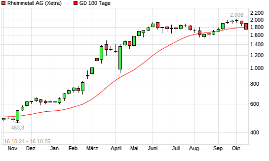 Mit dem Rücksetzer auf 1.741,50 EUR hat die Rheinmetall-Aktie am 15.10.2025 die 100-Tage-Linie nach unten gekreuzt.Die Rheinmetall-Aktie befindet sich seit dem 06.11.2024 im langfristigen ...weiterlesen
