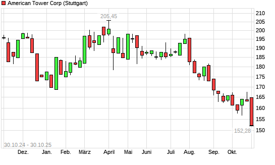 Mit dem Rücksetzer auf 156,66 EUR hat die American Tower-Aktie (ISIN US03027X1000) am 29.10.2025 ein neues 12-Monats-Tief erreicht und damit den Kurs vom 14.10.2025 eingestellt.Die American ...weiterlesen