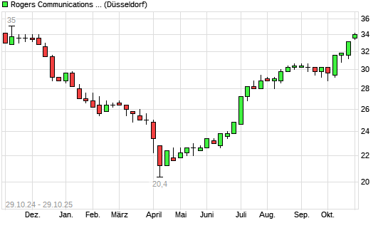 Mit dem Anstieg auf 34,00 EUR hat die Rogers Communications-Aktie (ISIN CA7751092007) am 28.10.2025 ein neues 6-Monats-Hoch erreicht und damit den Kurs vom 27.10.2025 eingestellt.Die Rogers ...weiterlesen