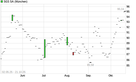 Mit dem Anstieg auf 94,92 EUR hat die SGS-Aktie (ISIN CH1256740924) am 20.10.2025 ein neues 6-Monats-Hoch erreicht und damit den Kurs vom 21.05.2025 eingestellt.Die SGS-Aktie befindet sich seit ...weiterlesen