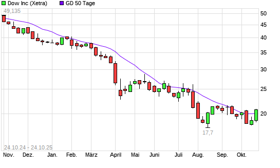 Mit dem Anstieg auf 20,70 EUR hat die Dow-Aktie am 23.10.2025 die 50-Tage-Linie nach oben gekreuzt.Die Dow-Aktie befindet sich seit dem 19.07.2024 im langfristigen Abwärtstrend und hat in diesem ...weiterlesen