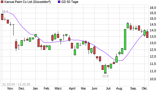 Mit dem Rücksetzer auf 13,70 EUR hat die Kansai Paint-Aktie am 10.10.2025 die 50-Tage-Linie nach unten gekreuzt.Die Kansai Paint-Aktie befindet sich seit dem 12.08.2025 im langfristigen ...weiterlesen