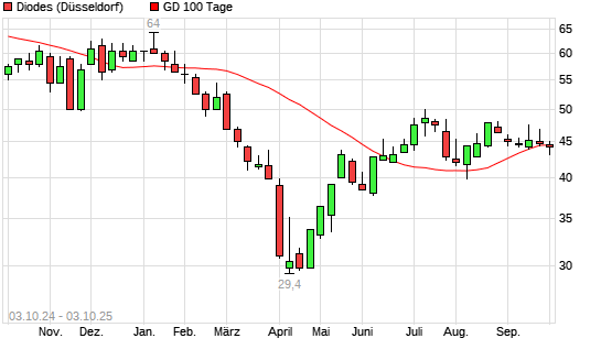 Mit dem Rücksetzer auf 43,40 EUR hat die Diodes-Aktie am 02.10.2025 die 100-Tage-Linie nach unten gekreuzt.Die Diodes-Aktie befindet sich seit dem 26.09.2025 im langfristigen Abwärtstrend ...weiterlesen