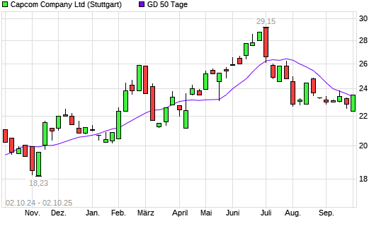 Mit dem Anstieg auf 23,62 EUR hat die Capcom-Aktie am 01.10.2025 die 50-Tage-Linie nach oben gekreuzt.Die Capcom-Aktie befindet sich seit dem 19.09.2025 im langfristigen Abwärtstrend und hat ...weiterlesen