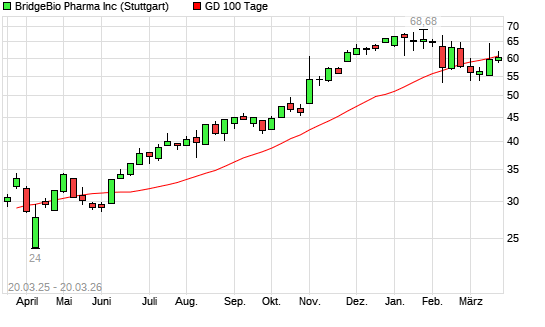 Mit dem Rücksetzer auf 61,30 EUR hat die BridgeBio Pharma-Aktie am 19.03.2026 die 100-Tage-Linie nach unten gekreuzt.Die BridgeBio Pharma-Aktie befindet sich seit dem 10.04.2025 ...weiterlesen