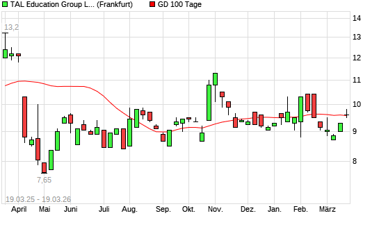 Mit dem Anstieg auf 9,80 EUR hat die TAL Education-Aktie am 18.03.2026 die 100-Tage-Linie nach oben gekreuzt.Die TAL Education-Aktie befindet sich seit dem 16.03.2026 im ...weiterlesen