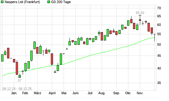 Mit dem Anstieg auf 55,00 EUR hat die Naspers-Aktie am 05.12.2025 die 200-Tage-Linie nach oben gekreuzt.Die Naspers-Aktie befand sich seit dem 03.12.2025 im langfristigen Abwärtstrend und hat ...weiterlesen