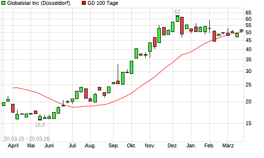Mit dem Rücksetzer auf 49,80 EUR hat die Globalstar-Aktie am 19.03.2026 die 100-Tage-Linie nach unten gekreuzt.Die Globalstar-Aktie befindet sich seit dem 22.08.2025 im ...weiterlesen
