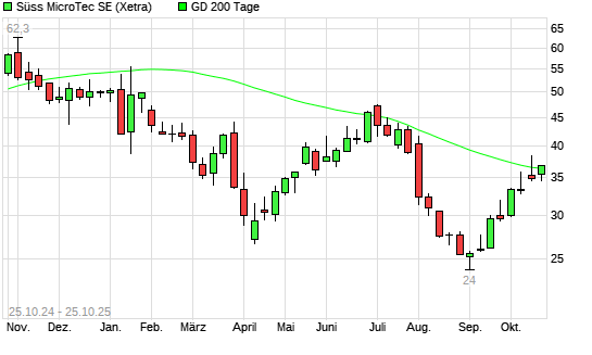 Mit dem Anstieg auf 36,62 EUR hat die Suess MicroTec-Aktie am 24.10.2025 die 200-Tage-Linie nach oben gekreuzt.Die Suess MicroTec-Aktie befand sich seit dem 16.10.2025 im langfristigen Abwärtstrend ...weiterlesen