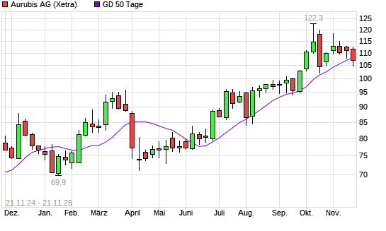 Mit dem Anstieg auf 109,00 EUR hat die Aurubis-Aktie am 20.11.2025 die 50-Tage-Linie nach oben gekreuzt.Die Aurubis-Aktie befindet sich seit dem 07.05.2025 im langfristigen Aufwärtstrend und ...weiterlesen