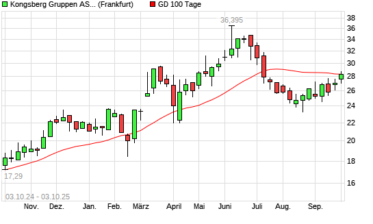 Mit dem Anstieg auf 28,78 EUR hat die Kongsberg-Aktie am 02.10.2025 die 100-Tage-Linie nach oben gekreuzt.Die Kongsberg-Aktie befindet sich seit dem 22.09.2025 im langfristigen Aufwärtstrend ...weiterlesen