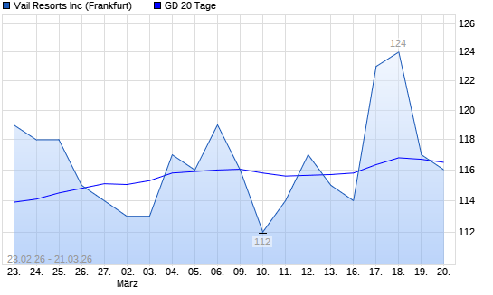 Mit dem Rücksetzer auf 116,00 EUR hat die Vail Resorts-Aktie am 20.03.2026 die 20-Tage-Linie nach unten gekreuzt.Die Vail Resorts-Aktie befindet sich seit dem 19.12.2025 ...weiterlesen