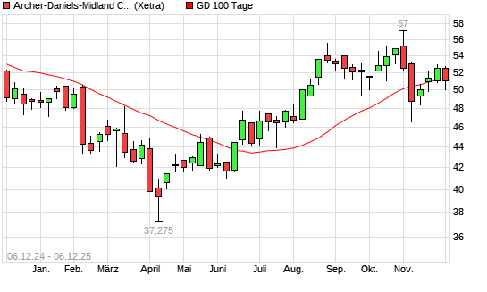 Mit dem Rücksetzer auf 50,96 EUR hat die Archer-Daniels-Midland-Aktie am 05.12.2025 die 100-Tage-Linie nach unten gekreuzt.Die Archer-Daniels-Midland-Aktie befindet sich seit dem 18.07.2025 ...weiterlesen