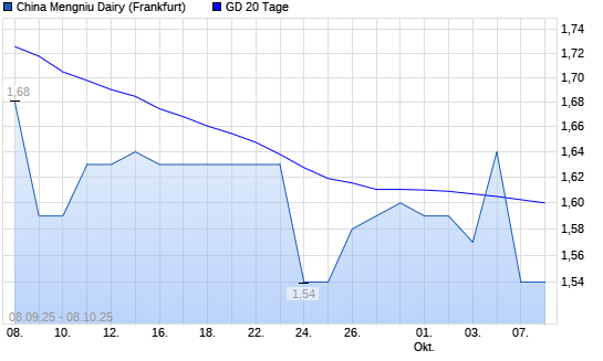 Mit dem Rücksetzer auf 1,54 EUR hat die China Mengniu Dairy-Aktie am 07.10.2025 die 20-Tage-Linie nach unten gekreuzt.Die China Mengniu Dairy-Aktie befindet sich seit dem 27.05.2025 im ...weiterlesen