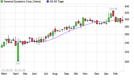 Mit dem Anstieg auf 301,45 EUR hat die General Dynamics-Aktie am 20.02.2026 die 50-Tage-Linie nach oben gekreuzt.Die General Dynamics-Aktie befindet sich seit dem 09.07.2025 ...weiterlesen