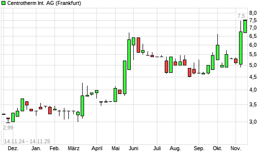 Mit dem Anstieg auf 7,50 EUR hat die CENTROTHERM PHOTOV.KONV.-Aktie (ISIN DE000A1TNMM9) am 13.11.2025 ein neues 10-Jahres-Hoch erreicht und damit den Kurs vom 11.11.2025 eingestellt.Die CENTROTHERM ...weiterlesen