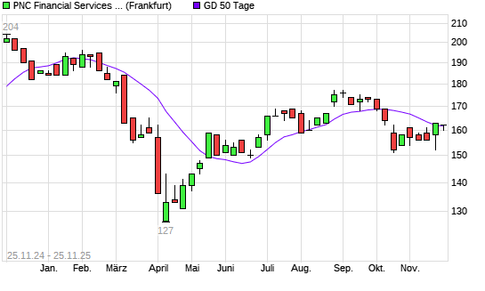 Mit dem Rücksetzer auf 160,00 EUR hat die PNC Financial Services-Aktie am 24.11.2025 die 50-Tage-Linie nach unten gekreuzt.Die PNC Financial Services-Aktie befindet sich seit dem 20.11.2025 ...weiterlesen