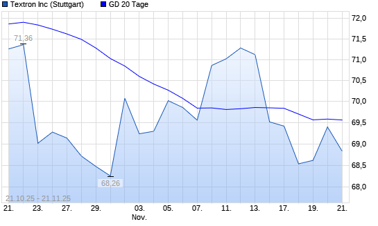 Mit dem Anstieg auf 69,76 EUR hat die Textron-Aktie am 20.11.2025 die 20-Tage-Linie nach oben gekreuzt.Die Textron-Aktie befindet sich seit dem 09.09.2025 im langfristigen Aufwärtstrend und ...weiterlesen