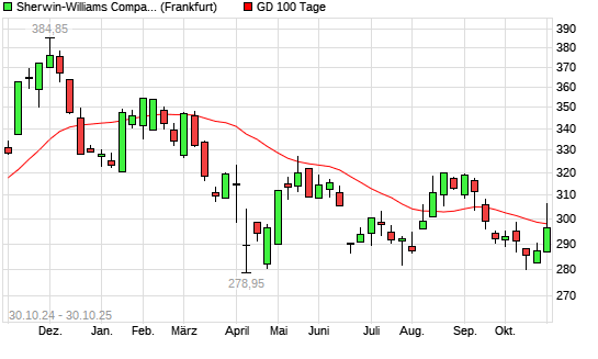 Mit dem Anstieg auf 306,30 EUR hat die Sherwin-Williams-Aktie am 29.10.2025 die 100-Tage-Linie nach oben gekreuzt.Die Sherwin-Williams-Aktie befindet sich seit dem 08.09.2025 im langfristigen ...weiterlesen