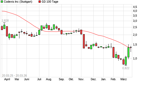 Mit dem Anstieg auf 1,38 EUR hat die Codexis-Aktie am 19.03.2026 die 100-Tage-Linie nach oben gekreuzt.Der Abstand zur 200-Tage-Linie beträgt aktuell -22,52%. Die ...weiterlesen