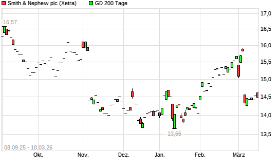 Mit dem Rücksetzer auf 14,33 EUR hat die Smith & Nephew-Aktie am 19.03.2026 die 200-Tage-Linie nach unten gekreuzt.Die Smith & Nephew-Aktie befand sich seit dem 18.03.2026 ...weiterlesen