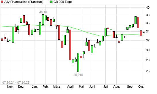 Mit dem Anstieg auf 33,85 EUR hat die Ally Financial-Aktie am 06.10.2025 die 200-Tage-Linie nach oben gekreuzt.Die Ally Financial-Aktie befand sich seit dem 01.10.2025 im langfristigen Abwärtstrend ...weiterlesen