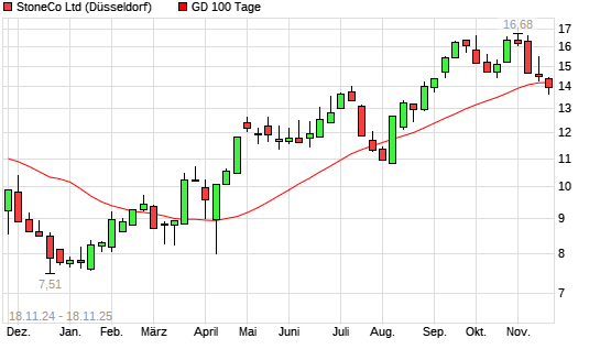 Mit dem Rücksetzer auf 14,07 EUR hat die Stoneco-Aktie am 17.11.2025 die 100-Tage-Linie nach unten gekreuzt.Die Stoneco-Aktie befindet sich seit dem 11.04.2025 im langfristigen Aufwärtstrend ...weiterlesen