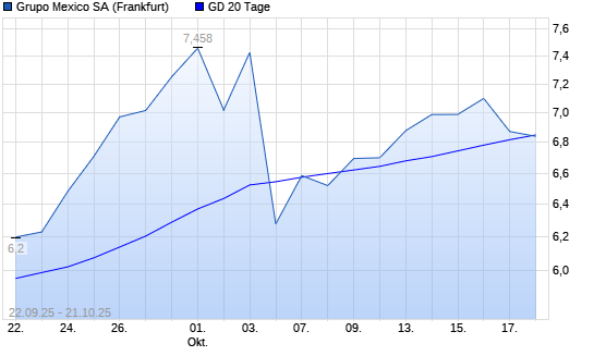 Mit dem Rücksetzer auf 6,84 EUR hat die Grupo Mexico-Aktie am 20.10.2025 die 20-Tage-Linie nach unten gekreuzt.Die Grupo Mexico-Aktie befindet sich seit dem 25.06.2025 im langfristigen ...weiterlesen