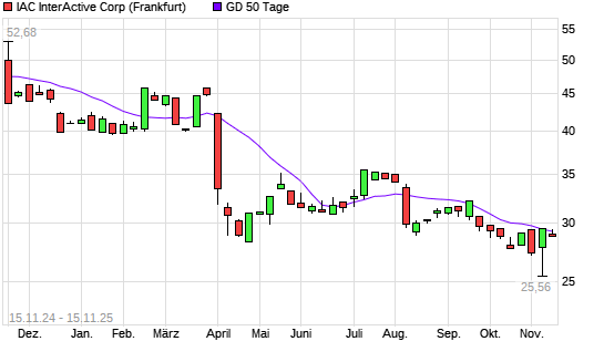 Mit dem Rücksetzer auf 28,83 EUR hat die IAC InterActiveCorp-Aktie am 14.11.2025 die 50-Tage-Linie nach unten gekreuzt.Die IAC InterActiveCorp-Aktie befindet sich seit dem 04.08.2025 im ...weiterlesen