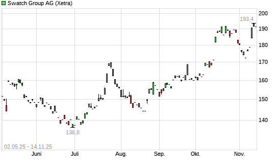 Mit dem Anstieg auf 190,05 EUR hat die Swatch Group Inhaber-Aktien-Aktie (ISIN CH0012255151) am 13.11.2025 ein neues 12-Monats-Hoch erreicht und damit den Kurs vom 25.02.2025 eingestellt.Die ...weiterlesen