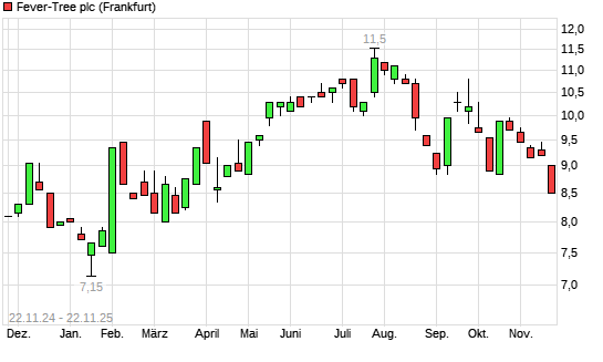 Mit dem Rücksetzer auf 8,50 EUR hat die Fever-Tree-Aktie (ISIN GB00BRJ9BJ26) am 21.11.2025 ein neues 6-Monats-Tief erreicht und damit den Kurs vom 20.11.2025 eingestellt.Die Fever-Tree-Aktie ...weiterlesen