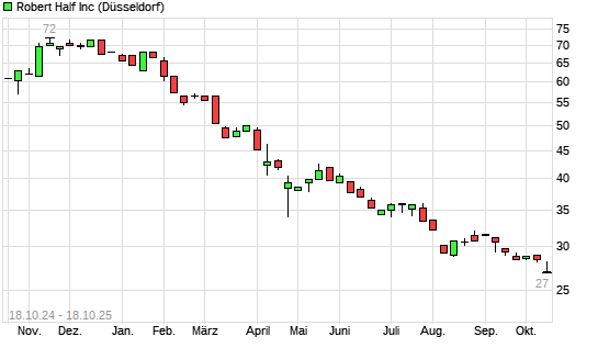 Mit dem Rücksetzer auf 27,00 EUR hat die Robert Half International-Aktie (ISIN US7703231032) am 17.10.2025 ein neues 10-Jahres-Tief erreicht und damit den Kurs vom 16.10.2025 eingestellt.Die ...weiterlesen