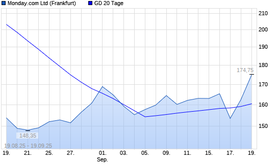 Mit dem Anstieg auf 162,40 EUR hat die Monday. Com-Aktie am 18.09.2025 die 20-Tage-Linie nach oben gekreuzt.Die Monday. Com-Aktie befindet sich seit dem 14.07.2025 im langfristigen Abwärtstrend ...weiterlesen