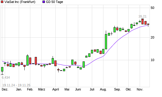 Mit dem Anstieg auf 30,88 EUR hat die ViaSat-Aktie am 18.11.2025 die 50-Tage-Linie nach oben gekreuzt.Der Abstand zur 200-Tage-Linie beträgt aktuell +89,12%. ##trendBox## Die ViaSat-Aktie ...weiterlesen