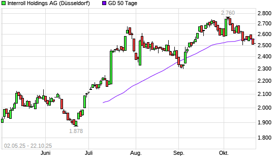 Mit dem Rücksetzer auf 2.540,00 EUR hat die INTERROLL HOLDINGS S-Aktie am 21.10.2025 die 50-Tage-Linie nach unten gekreuzt.Der Abstand zur 200-Tage-Linie beträgt aktuell +11,63%.