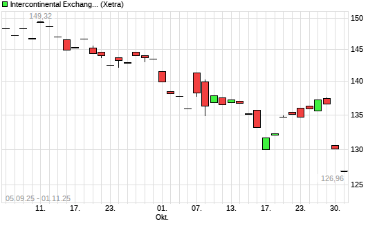 Mit dem Rücksetzer auf 126,60 EUR hat die IntercontinentalExchange Group-Aktie (ISIN US45866F1049) am 31.10.2025 ein neues 12-Monats-Tief erreicht und damit den Kurs vom 30.10.2025 eingestellt.Die ...weiterlesen