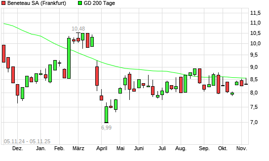 Mit dem Rücksetzer auf 8,53 EUR hat die Beneteau-Aktie am 04.11.2025 die 200-Tage-Linie nach unten gekreuzt.Die Beneteau-Aktie befand sich seit dem 03.11.2025 im langfristigen Aufwärtstrend ...weiterlesen