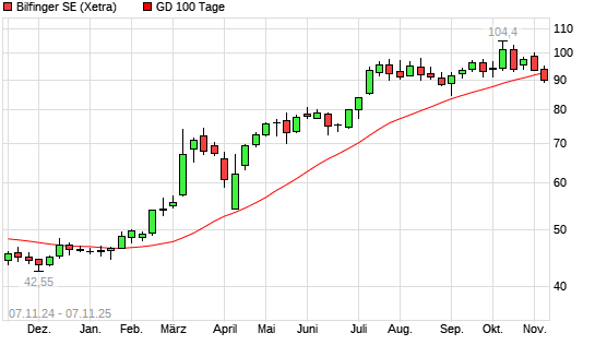 Mit dem Rücksetzer auf 90,75 EUR hat die Bilfinger-Aktie am 06.11.2025 die 100-Tage-Linie nach unten gekreuzt.Die Bilfinger-Aktie befindet sich seit dem 22.01.2025 im langfristigen Aufwärtstrend ...weiterlesen