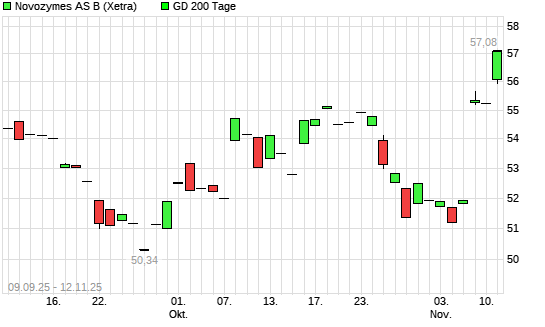 Mit dem Anstieg auf 56,96 EUR hat die Novonesis-Aktie am 11.11.2025 die 200-Tage-Linie nach oben gekreuzt.Die Novonesis-Aktie befand sich seit dem 06.08.2025 im langfristigen Abwärtstrend und ...weiterlesen
