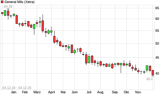 Mit dem Rücksetzer auf 39,42 EUR hat die General Mills-Aktie (ISIN US3703341046) am 03.12.2025 ein neues 5-Jahres-Tief erreicht und damit den Kurs vom 02.12.2025 eingestellt.Die General ...weiterlesen