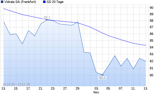 Mit dem Anstieg auf 82,40 EUR hat die VIDRALA SA INH.-Aktie am 12.11.2025 die 20-Tage-Linie nach oben gekreuzt.Die VIDRALA SA INH.-Aktie befindet sich seit dem 19.08.2025 im langfristigen Abwärtstrend ...weiterlesen