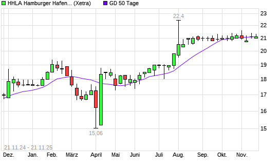 Mit dem Rücksetzer auf 21,00 EUR hat die HHLA-Aktie am 20.11.2025 die 50-Tage-Linie nach unten gekreuzt.Die HHLA-Aktie befindet sich seit dem 08.04.2025 im langfristigen Aufwärtstrend und ...weiterlesen