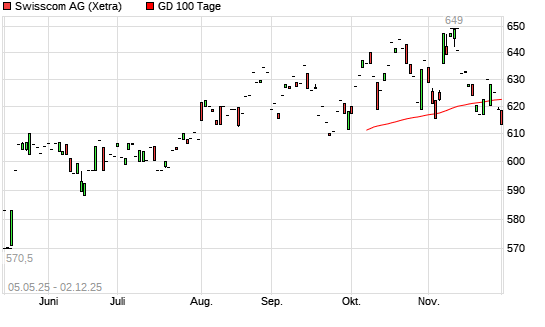 Mit dem Rücksetzer auf 615,50 EUR hat die Swisscom-Aktie am 01.12.2025 die 100-Tage-Linie nach unten gekreuzt.Die Swisscom-Aktie befindet sich seit dem 11.04.2025 im langfristigen Aufwärtstrend ...weiterlesen