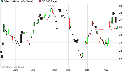 Mit dem Rücksetzer auf 25,76 EUR hat die Adecco-Aktie am 19.11.2025 die 100-Tage-Linie nach unten gekreuzt.Die Adecco-Aktie befindet sich seit dem 06.11.2025 im langfristigen Aufwärtstrend ...weiterlesen