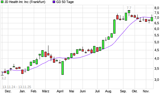 Mit dem Anstieg auf 7,30 EUR hat die JD Health-Aktie am 12.11.2025 die 50-Tage-Linie nach oben gekreuzt.Die JD Health-Aktie befindet sich seit dem 08.04.2025 im langfristigen Aufwärtstrend und ...weiterlesen