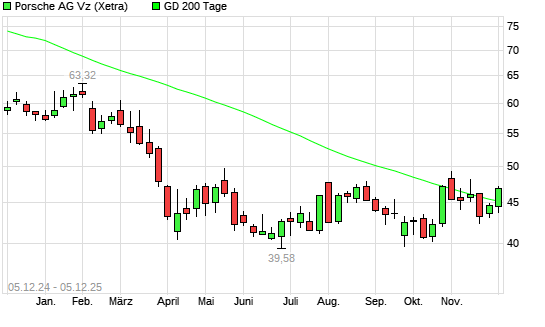 Mit dem Anstieg auf 46,78 EUR hat die Porsche AG Vz.-Aktie am 04.12.2025 die 200-Tage-Linie nach oben gekreuzt.Die Porsche AG Vz.-Aktie befand sich seit dem 14.11.2025 im langfristigen Abwärtstrend ...weiterlesen