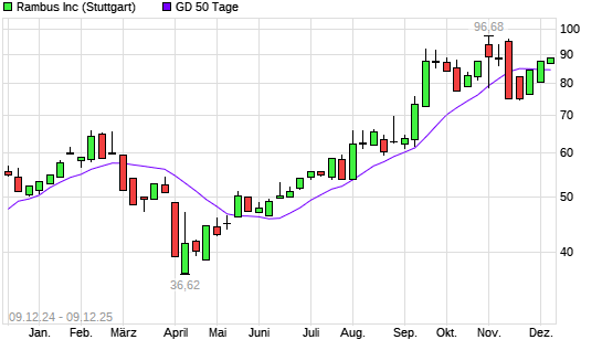 Mit dem Anstieg auf 88,90 EUR hat die Rambus-Aktie am 08.12.2025 die 50-Tage-Linie nach oben gekreuzt.Die Rambus-Aktie befindet sich seit dem 04.06.2025 im langfristigen Aufwärtstrend und hat ...weiterlesen