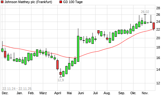 Mit dem Rücksetzer auf 22,18 EUR hat die Johnson Matthey-Aktie am 21.11.2025 die 100-Tage-Linie nach unten gekreuzt.Die Johnson Matthey-Aktie befindet sich seit dem 21.05.2025 im langfristigen ...weiterlesen